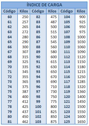 Separados por un espacio comienza el segundo código (87V). El índice de 87 en nuestro caso representa un soporte de hasta 545 kilogramos por neumático; siempre y cuando esté inflado a máxima presión de seguridad. Este dato es fundamental a la hora de cargar peso tipo equipaje o mercancía. Te invitamos a consultar la siguiente tabla y averiguar cuánta carga soporta los tuyos: