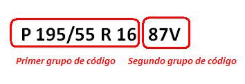 La P advierte de vehículo de pasajeros, si fuera una T señalaría uso temporal (rueda de repuesto), la LT sería de camión ligero y la ST, tráiler especial. Los siguientes dos números advierten de la anchura del neumático inflado: 195 mm en nuestro caso, seguido de un 55 referido a la altura como porcentaje de la anchura, o sea, el 55% de 195 mm da como resultado 107,25 mm de altura (P 195/55 R 16 87V).